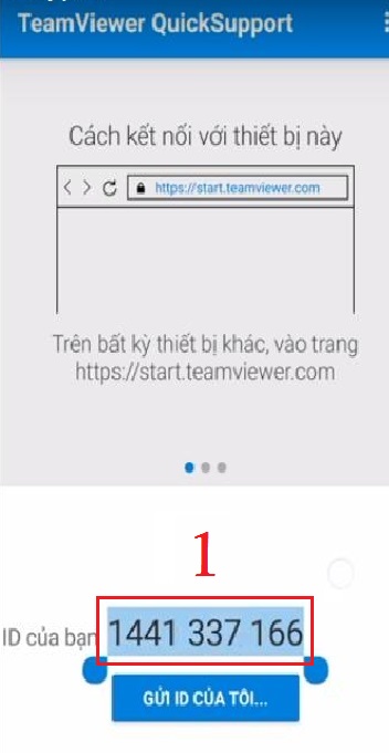 B1: Sau khi đã cài đặt ứng dụng TeamViewer QuickSupport trên điện thoại. Khởi động và copy mục ID của bạn để gửi cho thiết bị điều khiển.