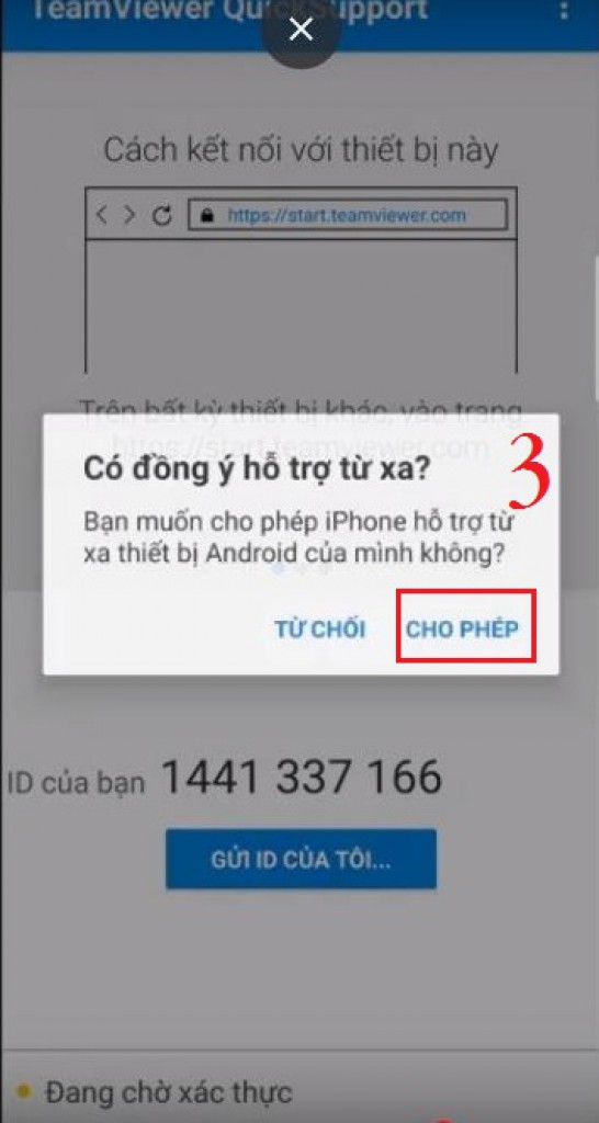 B3: Sau đó sẽ có hộp thoại chờ xác nhận có đồng ý hỗ trợ từ xa. ⚠⚠⚠Bạn phải bấm CHO PHÉP thì kết nối mới được thiết lập giữa 2 bên.
